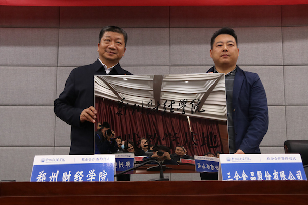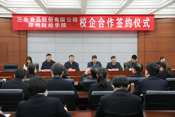 11月26日,郑州财经学院与三全食品股份有限公司在行政楼A座二楼连廊会议室签署校企合作协议,共同搭建校企合作平台。三全食品股份有限公司党委副书记金小飞、电商运营公司总经理闫举建、仓储物流中心总监杨伟召、人资部经理魏广杨、人事招聘经理杨松楠,我校常务副校长李庆阳、电子商务学院院长冀延卿、现代物流与管理学院院长杜书云、艺术设计学院院长任留柱,以及电子商务学院、现代物流与管理学院、艺术学院教师代表参加本次签约仪式。