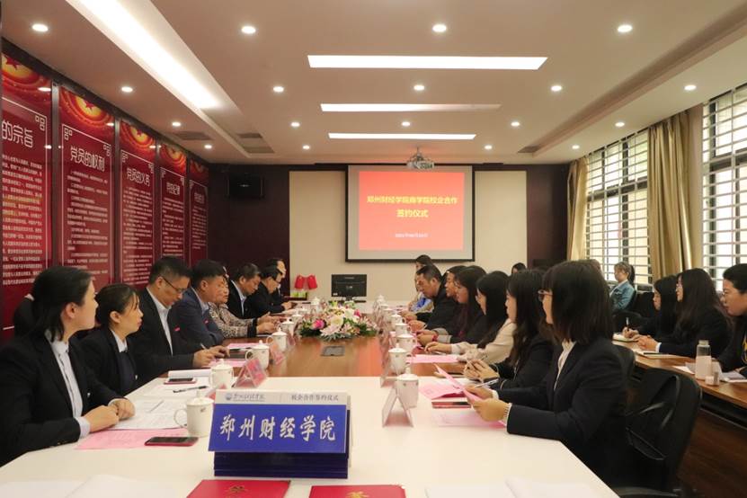 423日上午,郑州财经学院商学院校企合作签约仪式在行政楼C座208会议室举行,郑州九六一电子商务有限公司首席文化官范永军一行、郑州巨木服饰有限公司人力资源总监危近松一行、网易有道信息技术有限公司人力资源总负责人种亚林一行、郑州超航房地产经济有限公司人力资源中心总监古林静一行莅临我校,我校校长于向英、常务副校长李庆阳、党委副书记董学力,产教融合协同创新中心主任方润生、就业办主任谷峥,商学院院长冀延卿、党总支书记宋艳萍、副院长郭瑞强、张柯及商学院部分师生代表参加签约仪式。签约仪式由张柯主持。