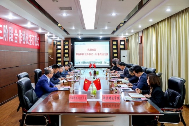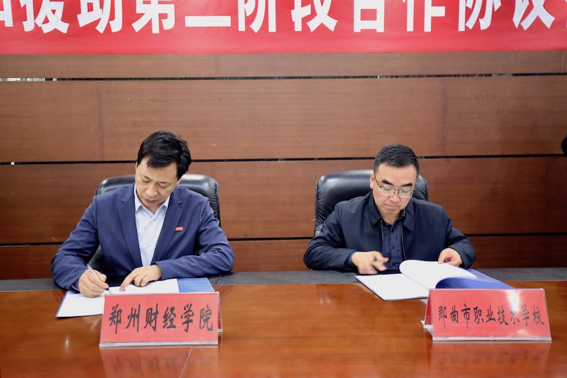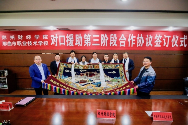 4月29日上午,我校与那曲市职业技术学校在A楼第一会议室签订了对口援助第三阶段合作协议,河南省教育厅发展规划处处长宋振,那曲市职业技术学校党委书记丁涛、办公室主任陈彦华、援助办公室负责人久西多吉,我校党委书记李国强、校长于向英、理事长牛钦民、常务副校长李庆阳,党办、校办、援藏办负责人出席会议,会议由李庆阳主持。