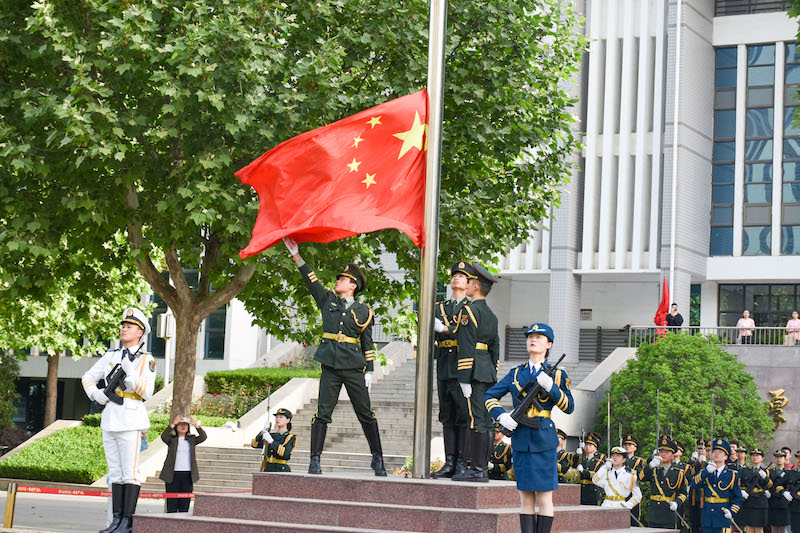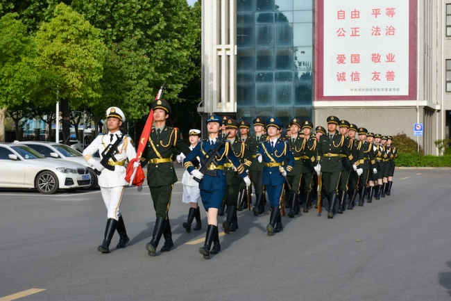 英姿飒爽的国旗护卫队迈着整齐坚定的步伐,以饱满的热情,昂扬的姿态,正步走向升旗台。伴随着庄严的国歌入团宣誓仪式正式开始