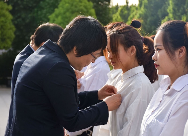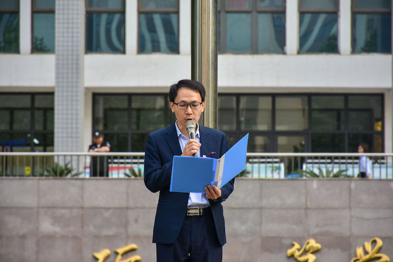 校团委组织部薛子豪老师宣读新团员名单,副校长陈静在场教师220名新团员佩戴团徽。