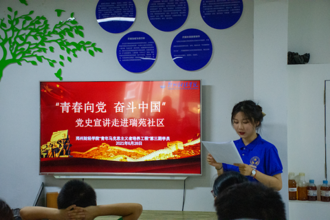 为推动党史学习教育不断走深走实走进人心,讲好党史、新中国史、改革开放史、社会主义发展史,强化爱国之志,凝聚爱国力量,6月28日至30日,由“青年讲师团”青马班学员组成的我校党史宣讲团走进惠济区的瑞苑社区、老鸦陈村、南阳寨村,开展以“青春向党 奋斗中国”为主题的党史宣讲。这也是我校青马班学员开启“种果青年”暑期社会实践的郑州宣讲站。