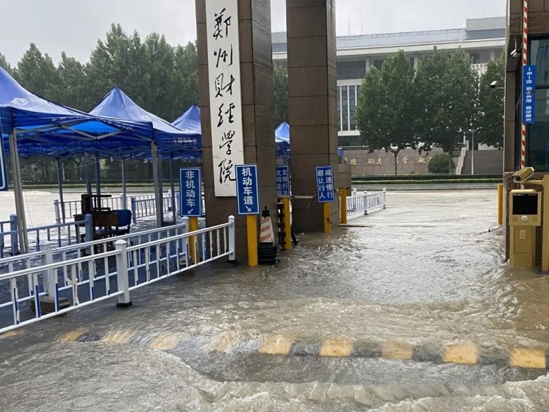在遭受重大汛期期间,郑州财经学院第一时间启动应急预案,安排部署抗洪工作,学校后勤、保卫等部门和暑期值班、加班教师全力展开校园防洪与排水等各项工作,对校园、学生公寓及周边重点区域进行定时、定点巡查;通过网络及时向学生发送汛情安全指南,逐一联系,确保学生生命安全;启动自然灾害困难救助并开展心理帮扶,全力保证师生生命健康和财产安全。