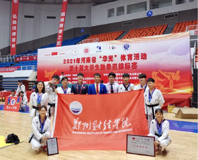 我校跆拳道队在学校领导的大力支持下,由体育教学部主任蒋恺领队,赵凡翔老师、路伟杰老师和高红建老师担任教练,经过5天激烈的角逐荣获2枚金牌28枚铜牌和本科甲组跆拳舞第三名优异成绩同时,郑州财经学院代表队也荣获此次大赛十佳组织奖称号