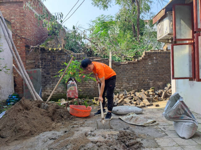 19级工商管理本1班陈明帅同学帮助受灾群众重新加固围墙