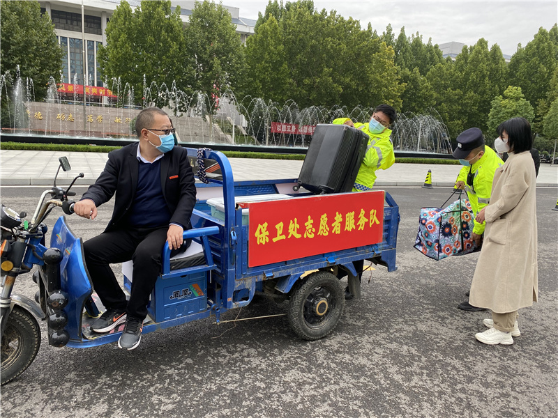 为避免人员聚集,返校学生需要自己搬运行李进入校园,家长尽快离开校门口,减少逗留时间。考虑到行李繁多不便随身携带,保卫处志愿者服务队、后勤支部先锋队用电动车帮助学生运送大件行李,往返于校门口和宿舍楼之间,用细致周到的服务迎接学生返校。