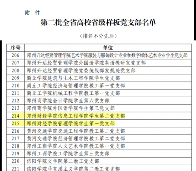 根据《中共河南省委教育工委关于公布第二批全省高校省级样板党支部评审结果的通知》(豫教工委〔2022〕11号),我校信息工程学院学生第二党支部和管理学院学生第一党支部被评为“第二批全省高校省级样板党支部”。