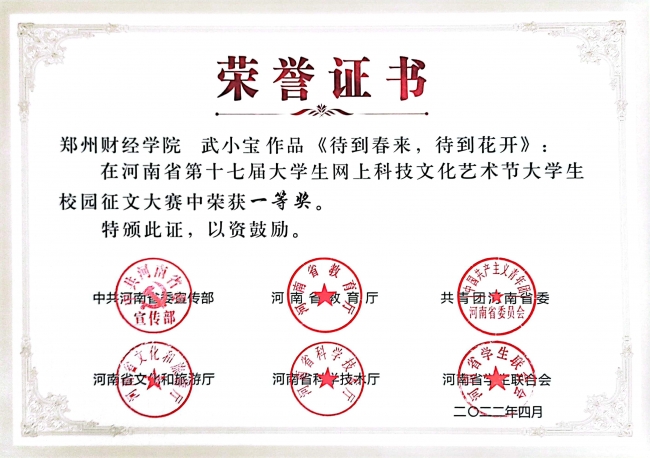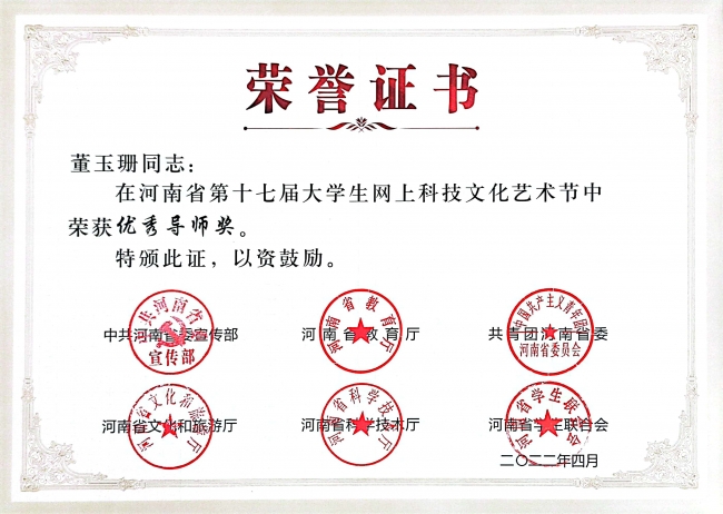 日前,河南省第十七届大学生网上科技文化艺术节获奖作品(个人)和优秀组织单位名单发布,其中,我校学子斩获一等奖3项、二等奖7项、三等奖11项,1名教师获得优秀导师奖。