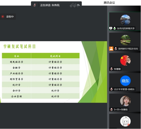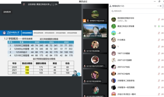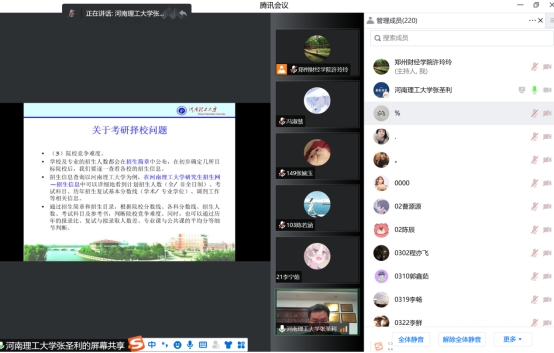 为了推动学科建设与专业发展,提升我校毕业生培养质量,调动学生考研积极性,我校科研处和智能财务研究所特邀省内外十所高校相关领导对我校学生进行研究生招生政策线上宣讲,宣讲活动在腾讯会议、微信公众号会计学术联盟同时进行直播。十所高校领导对考研形势、本校相关专业录取情况、考试内容及复试要求等进行了详细分析,内容详实,进一步坚定了我校学生的考研信心,取得了良好的宣讲效果。
