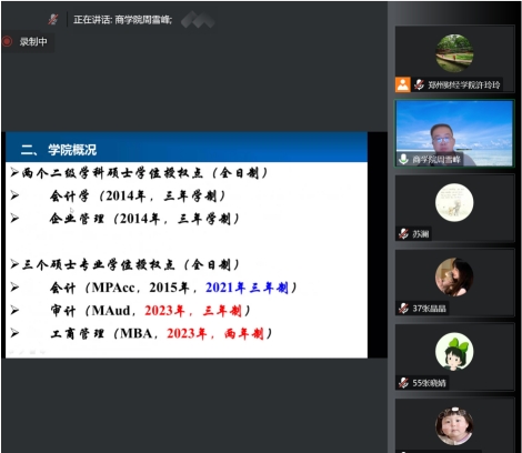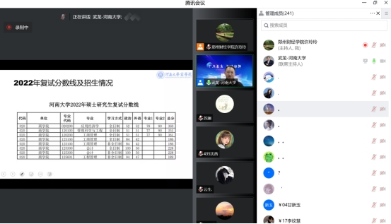 9月13日,河南大学商学院武龙教授对本院工商管理博士点及各级硕士学位招生情况进行了介绍,并且从报考省内外高校、学硕还是专硕等多方面给同学们提出了建议。同学们积极请教问题,线上参与互动,反响热烈。