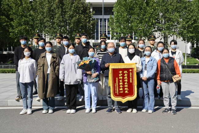 10月11日中午,我校青年志愿者服务中心将写有“抗击疫情采样规范,守护师生服务暖心”的锦旗赠送给惠济区人民医院,对惠济区人民医院医护人员支援我校全员核酸检测工作表达诚挚谢意。
