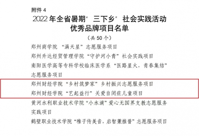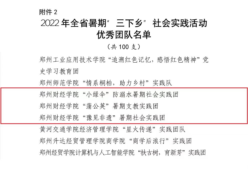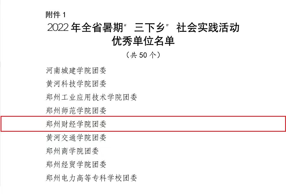 近日,共青团河南省委发布了《关于2022年全省暑期“三下乡”社会实践活动省级优秀工作典型的公示》,其中我校荣获河南省暑期“三下乡”社会实践活动优秀单位奖1项、优秀团队奖3项、优秀个人奖2项、优秀品牌项目2项。