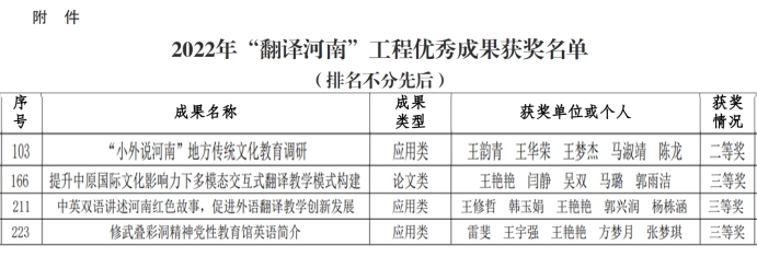 近日,中共河南省委外事工作委员会办公室下发《关于2022年度“翻译河南”工程优秀成果征集情况的通报》(豫外委办〔2023〕6号)文件,外国语学院王韵青老师的《“小外说河南”地方传统文化教育调研》获得二等奖,王艳艳老师的《提升中原国际文化影响力下多模态交互式翻译教学模式构建》、王修哲老师的《中英双语讲述河南红色故事,促进外语翻译教学创新发展》、雷斐老师的《修武叠彩洞精神党性教育馆英语简介》获得三等奖。