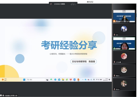 为了调动我校学生考研积极性,增强学生考研信心,明确目标方向,4月17日,教务处与智能财务研究所共同组织了2023年考研经验交流会,会议采用线上腾讯会议方式举行,来自不同学院的17名2023年考研拟录取同学进行了考研经验分享,我校100余名具有考研意向的同学参加会议。
