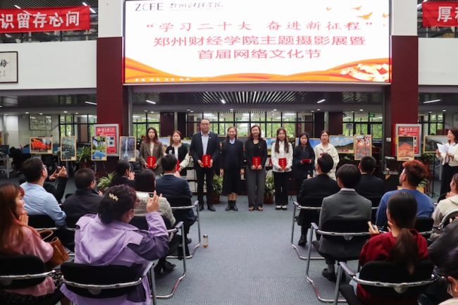 党委副书记董学力致开幕辞。他指出,为表达广大师生对党和国家的深厚情感,加强学校网络育人工作,学校开展了学习贯彻党的二十大精神特色活动——“奋进新征程 建功新时代”主题摄影比赛,举办了“传播青春正能量,争做校园好网民”郑州财经学院首届网络文化节优秀作品征集活动,本次获奖摄影作品与首届网络文化节评选出的优秀网络文化作品同时展出,旨在合力引领更多郑财师生以实际行动学思践悟党的二十大精神,培养浓厚的校园文化氛围。