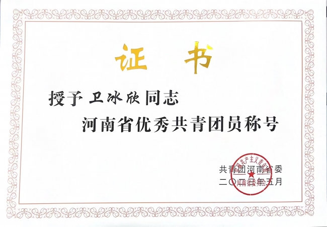 教育学院学生卫冰欣荣获“河南省优秀共青团员”称号