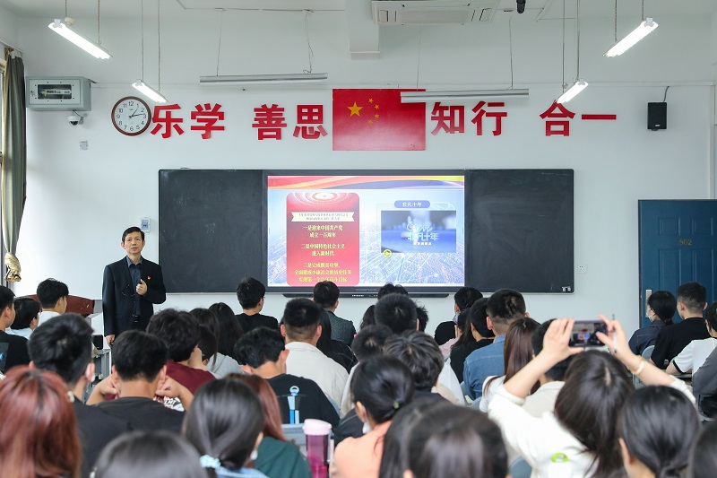 5月25日下午,副校长方润生在育智楼502教室为智能工程学院和外国语学院师生代表讲授专题党课。方润生紧密结合国内外形势,通过详实的数据和生动的案例,引导大家理解蕴含其中的深刻道理、学理、哲理。并勉励广大学子要坚定理想信念、强化理论武装,将共产主义理想转化为推动社会发展的强大力量;要心系家国、做新时代好青年,胸怀“国之大者”,以大智慧、大格局、大境界拥抱世界,成为怀抱梦想又脚踏实地,敢想敢为又善作善成,立志做有理想、敢担当、能吃苦、肯奋斗的新时代好青年。