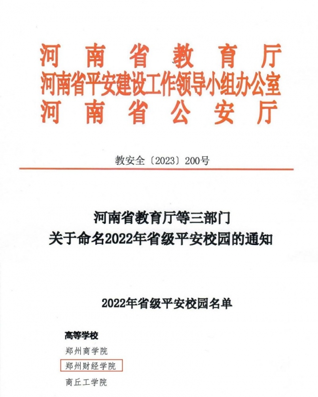 近日,河南省教育厅、河南省平安办、河南省公安厅联合下发了《关于命名2022年省级平安校园的通知》,我校荣获2022年“河南省级平安校园”称号,这是学校在平安校园创建工作上取得的新佳绩。