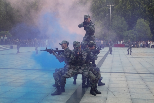 随后,全体国护队员们齐唱军歌。“丹心与日月同在,赤诚共红旗飞扬”,共同的理想激发出昂扬斗志,各方队精神抖擞、队列整齐,激昂豪迈的旋律将同学们带入了军旅生活,他们用振奋人心的声音,诠释了对五星红旗崇高的敬仰和对祖国深沉的爱。
