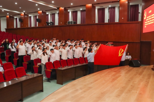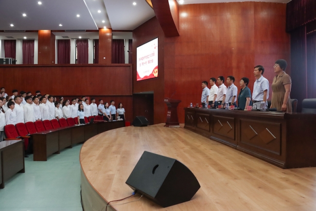 伴着庄严的国歌,大会正式拉开帷幕。新发展预备党员起立,由党委组织部副部长乔谷阳同志带领新发展预备党员进行入党宣誓,老党员重温入党誓词。铿锵有力的宣誓声响彻报告厅,振奋人心。