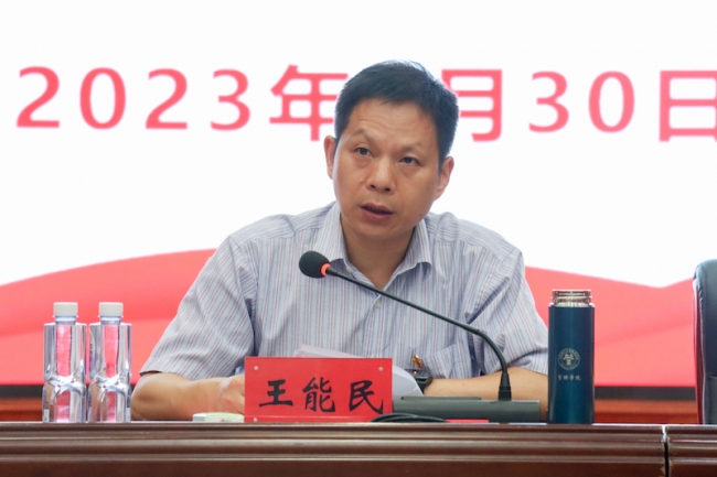 党委副书记、校长王能民发表讲话。他指出,今年是学习贯彻党的二十大精神的开局之年,也是我校第二次党代会即将召开之年,广大党员师生应铭记光辉历程,坚定理想信念;强化党建引领,积极担当作为;永葆党员本色,传承奋斗精神,牢牢把握时代机遇和学校发展契机,推动学校工作特别是党建工作高质量发展。就学校党建工作他提出三点要求:一是提高政治站位,把牢政治方向。二是强化宗旨意识,坚持师生至上。三是强化实干担当,切实履职尽责。他指出,“道虽迩,不行不至;事虽小,不为不成。”实践表明,每一项事业,无论大小,都是靠脚踏实地、一点一滴干出来的,实干是最朴质的方法论,务实重干是攻坚克难的基石,要以务实重干的工作作风强化履职尽责,在新时代展现新气象、新作为,实现新突破、新发展。
