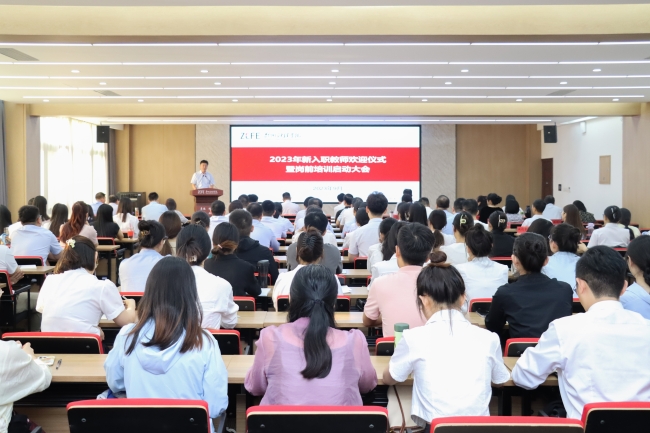 9月5日下午,郑州财经学院在德正楼第一学术报告厅隆重举行2023年新入职教师欢迎仪式暨岗前培训启动大会,全体校领导,各二级院部负责人、2022-2023学年优秀导师和学员代表、2023年新入职教师等参加会议。会议由校党委副书记董学力主持。