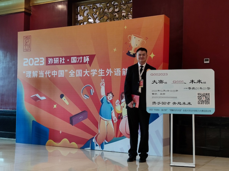 2023“外研社·国才杯”“理解当代中国”全国大学生外语能力大赛自启动以来,共吸引全国31个省(市、自治区)1300余所院校近百万选手参与。刘义同学通过校园初赛选拔,一路过关斩将,在河南省赛中获得特等奖入围国赛,最终取得佳绩。参赛数据显示,本次大赛参赛规模创新高,院校、专业类别更加多元,兼具普适性与挑战性。大赛以赛促学、以赛促教,有效服务国家国际传播能力建设,培养大学生理解当代中国、讲好中国故事的能力。